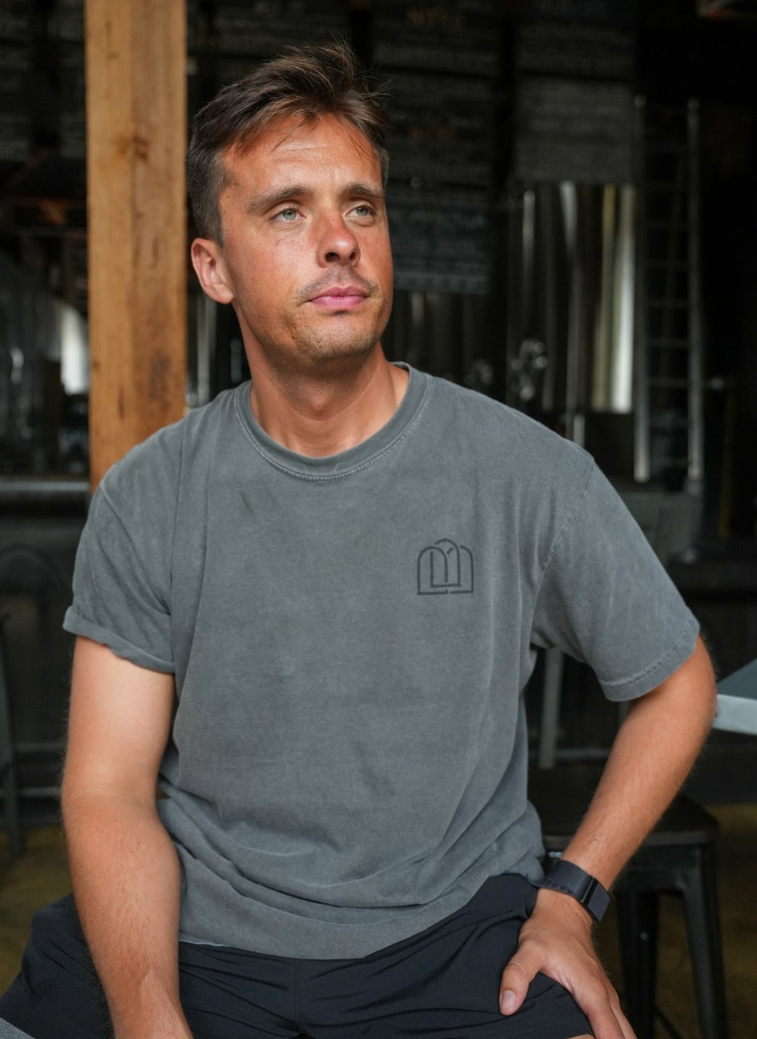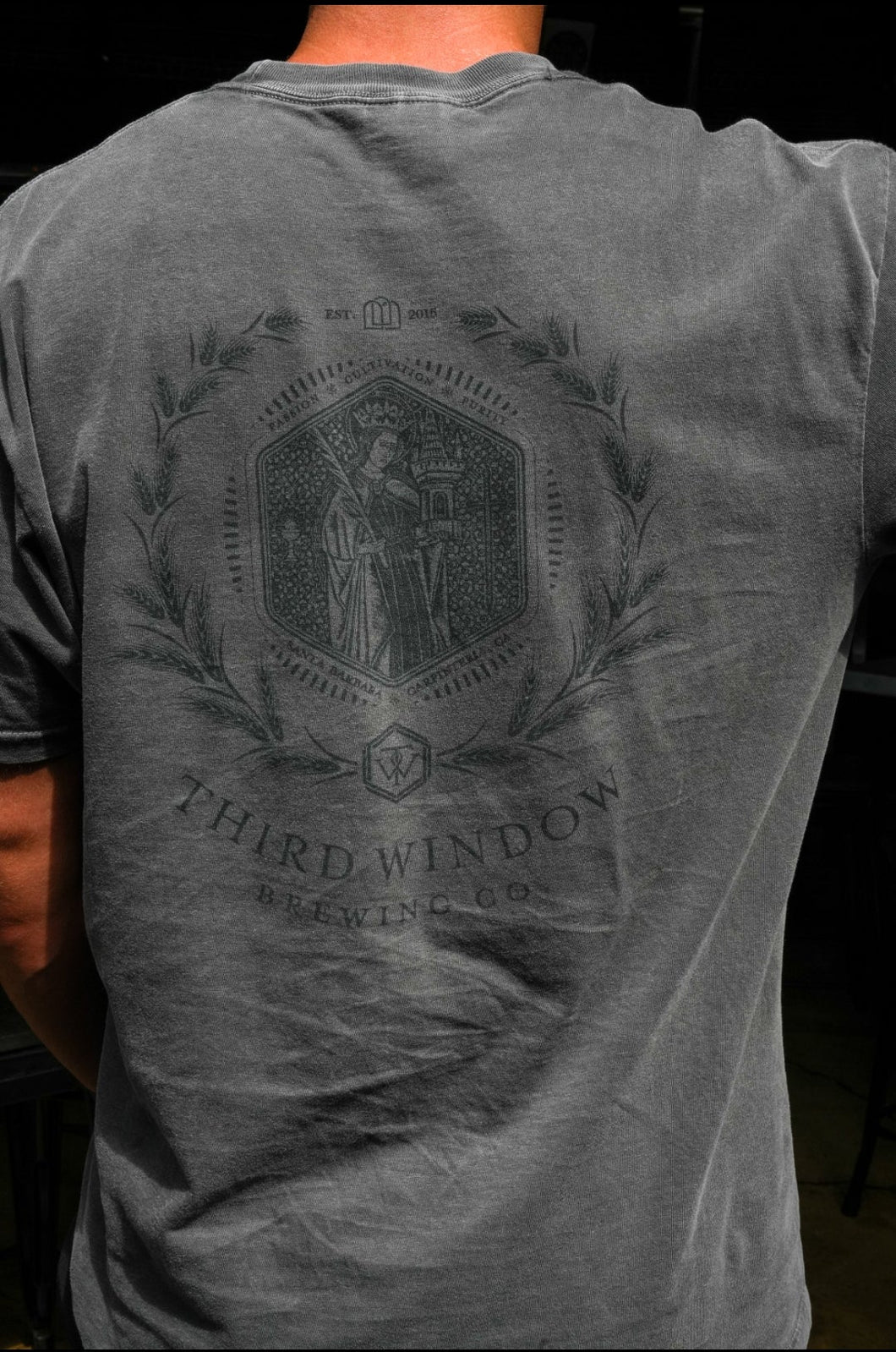 St. Barbara shirt featuring a 100% cotton comfort colors shirt with our signature arches front logo and St. Barbara depicted on the back surrounded by our estate grain.